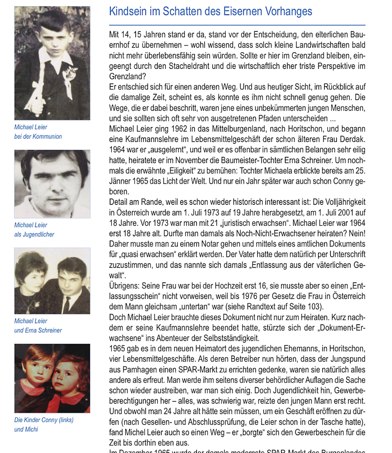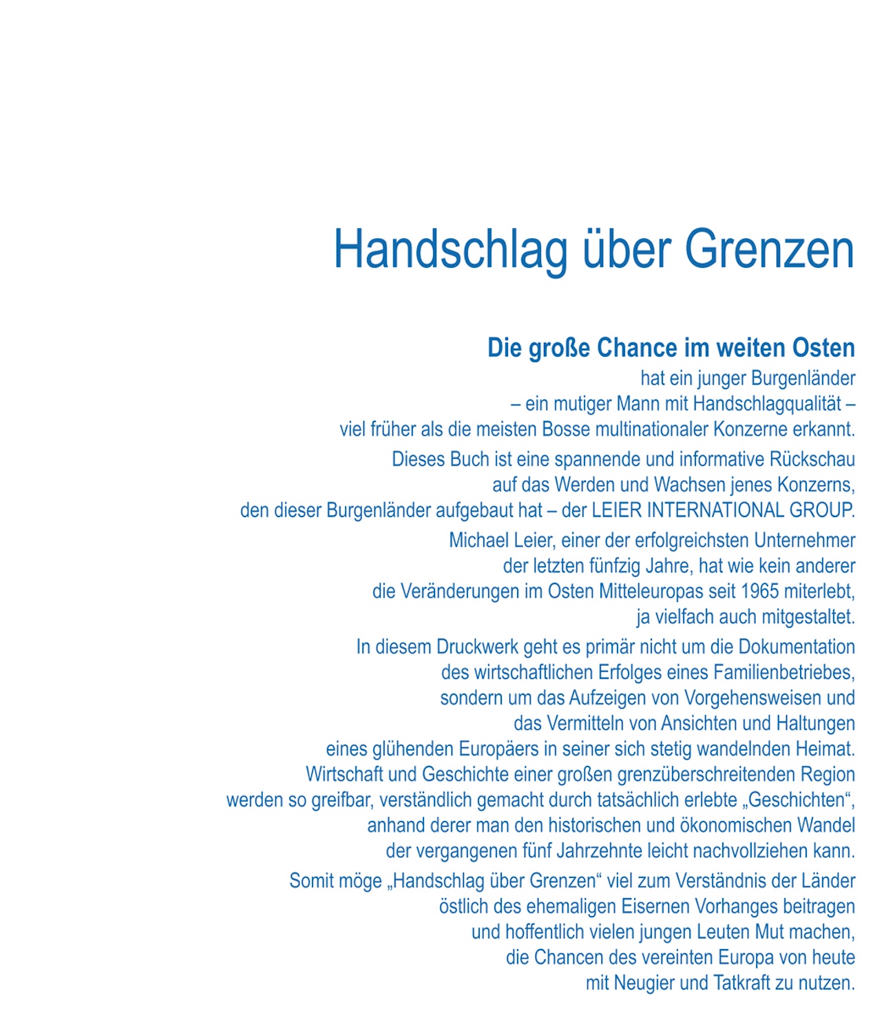 2015 feierte der Familienbetrieb „Leier International“ sein 50-jähriges Bestehen. Aus diesem Anlass erschien ein ausführliches Buch, das nicht nur den Werdegang des Parade-Unternehmers Michael Leier beschreibt, sondern auch leicht lesbar die Geschichte des Burgenlandes und der ehemaligen Ostblockländer nachzeichnet – garniert mit vielen Beispiele aus erlebter Praxis.